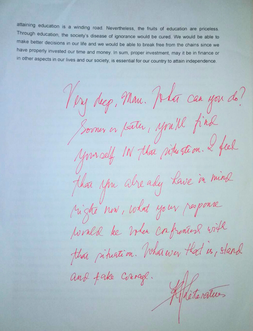 The journey of attaining education is a winding road, but the fruits of education are priceless. Through education, the society’s disease of ignorance would be cured. We would be able to make better decisions in our life and we would be able to break free from any chains that are binding us. That’s why proper investment, may it be in finance or in other aspects in our lives and our society, is essential for our country to attain true independence.