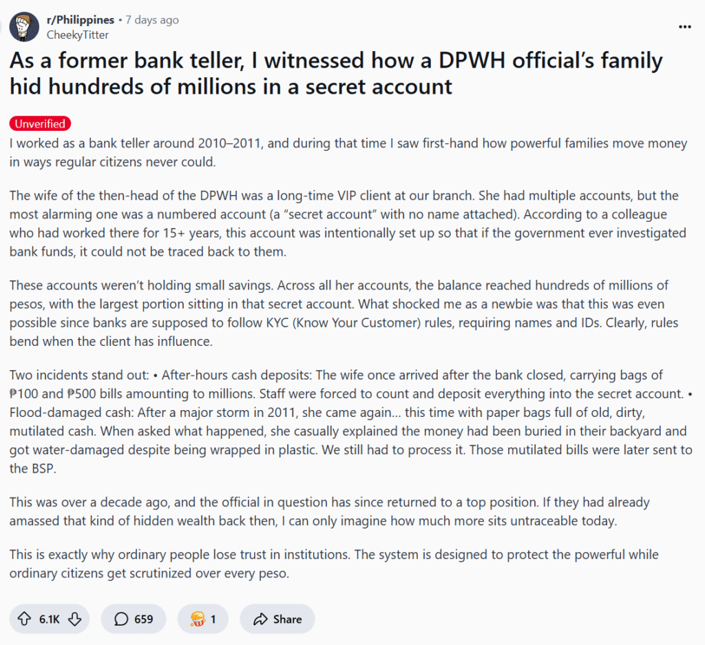 Even in the private sector, some bank employees manipulate and steal money from their client’s accounts instead of having integrity and following the financial regulations. Also, some would overstate reimbursements or cash advances relating to government transactions in order to gain kickbacks. Is it really worth it and conscientious to gain wealth from dirty money within the institution you’re working in and then feed that money to your family?